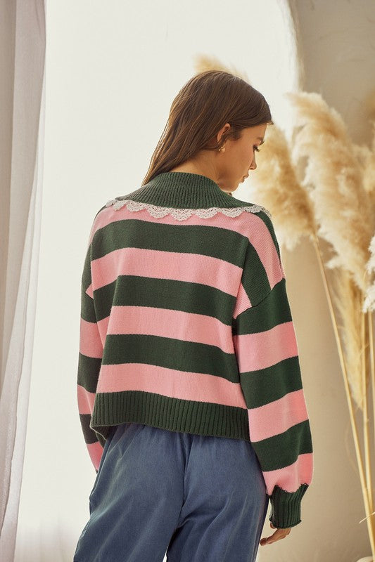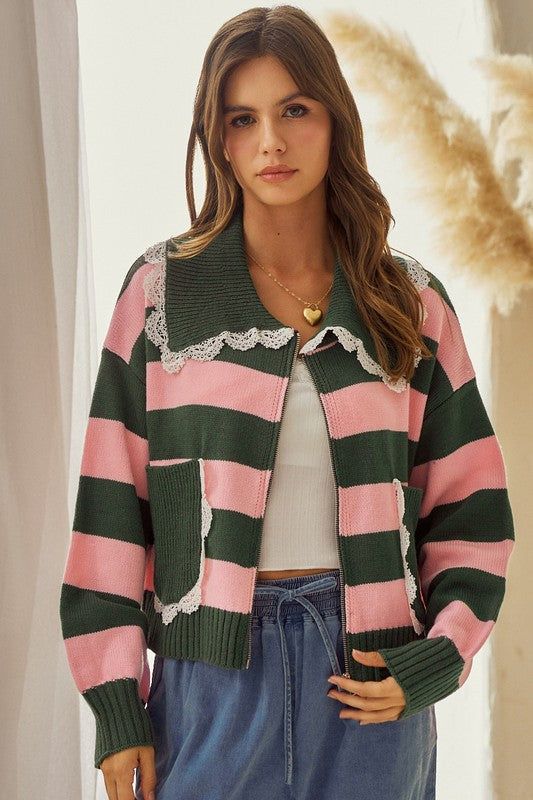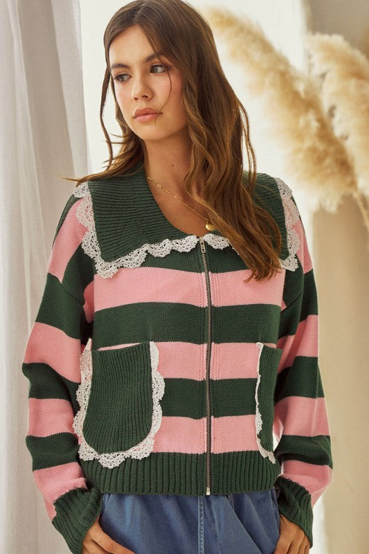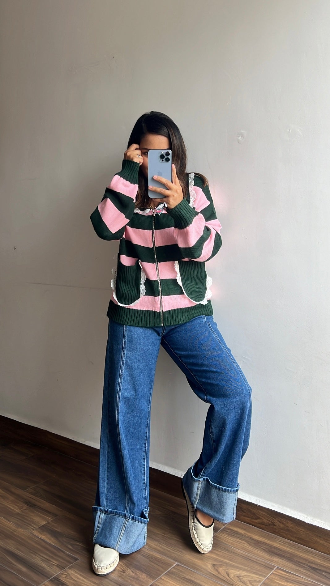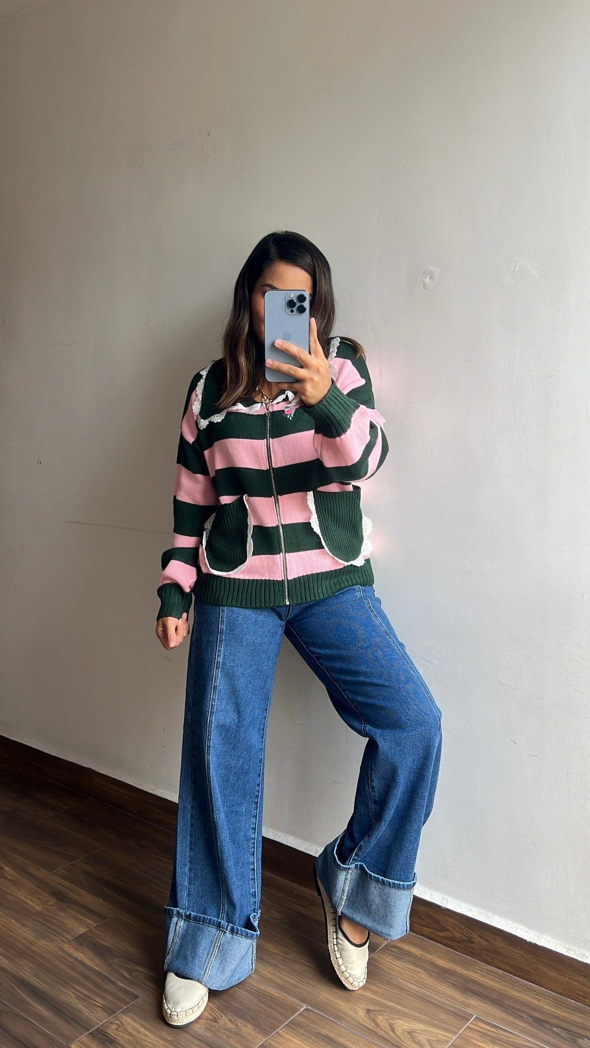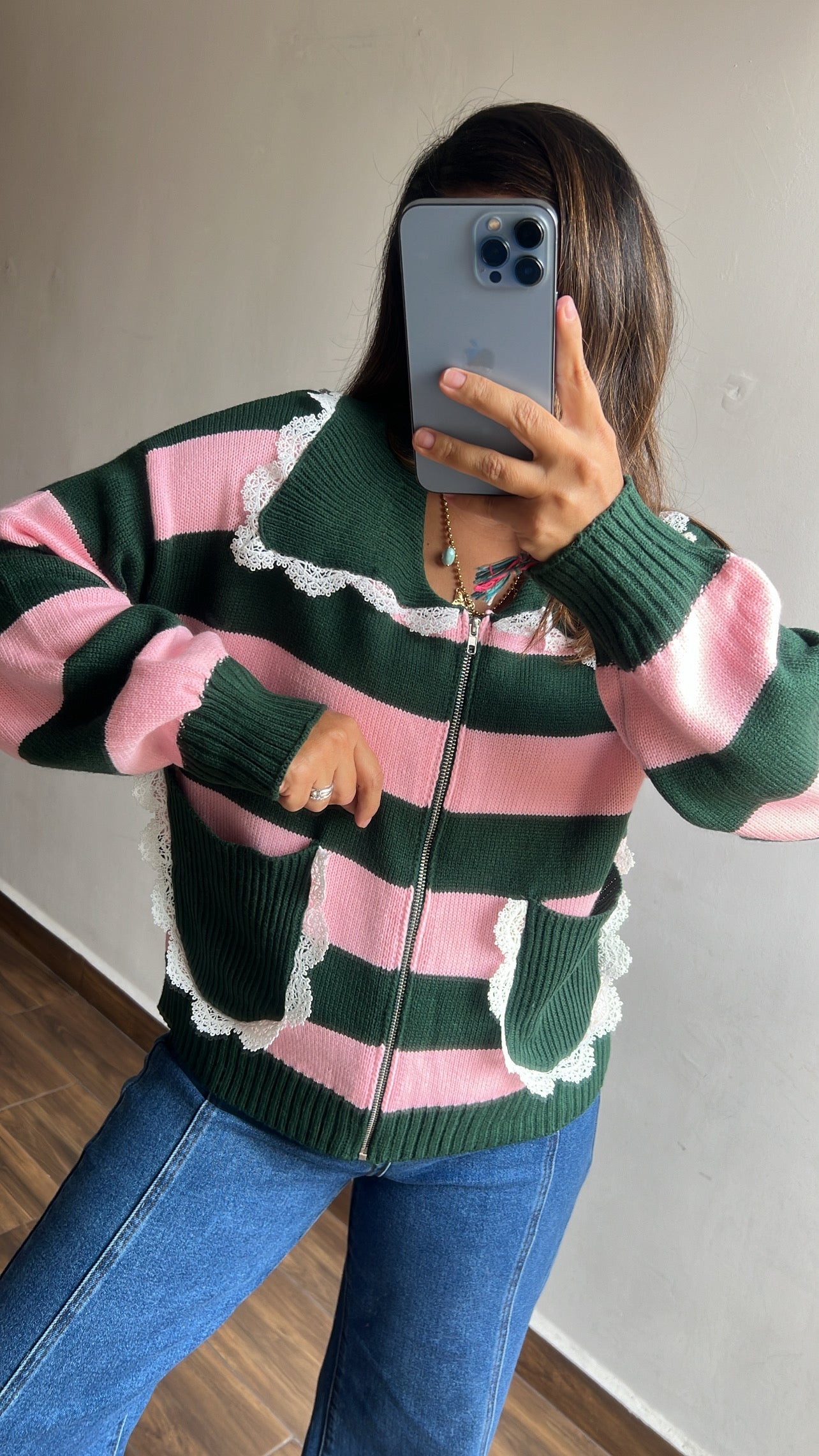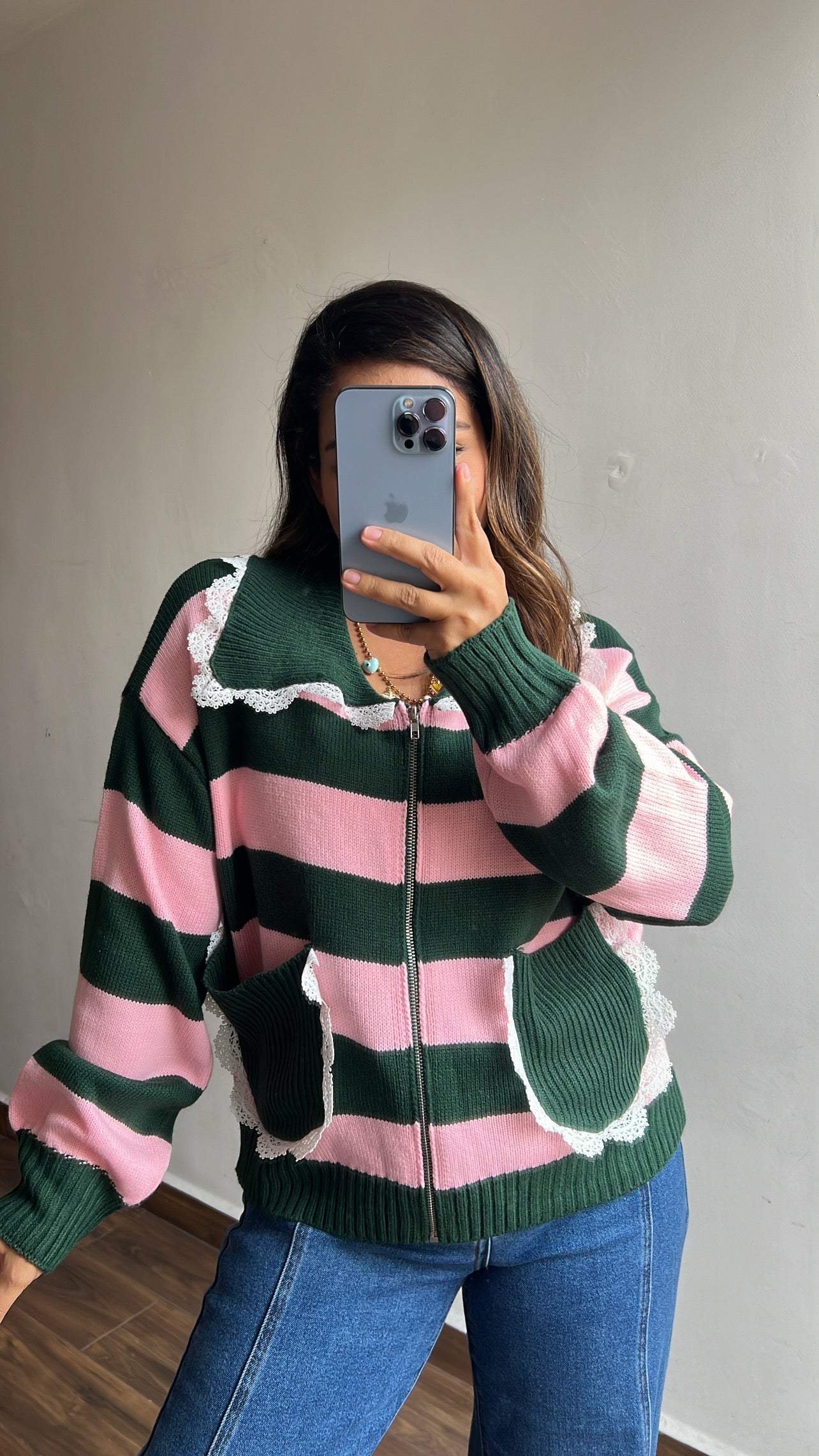 Cardigan a rayas rosas y verdes, con hermoso encaje en cuello y bolsas, cierre al frente.