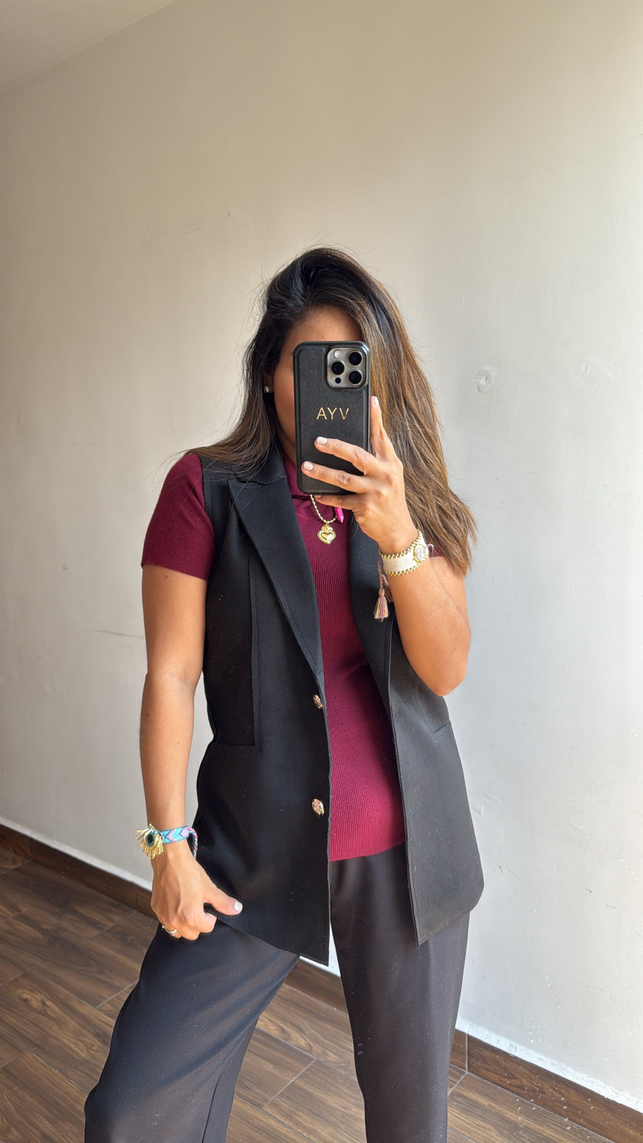 Chaleco con botones dorados, tela gruesa de composición poliéster y elastano.