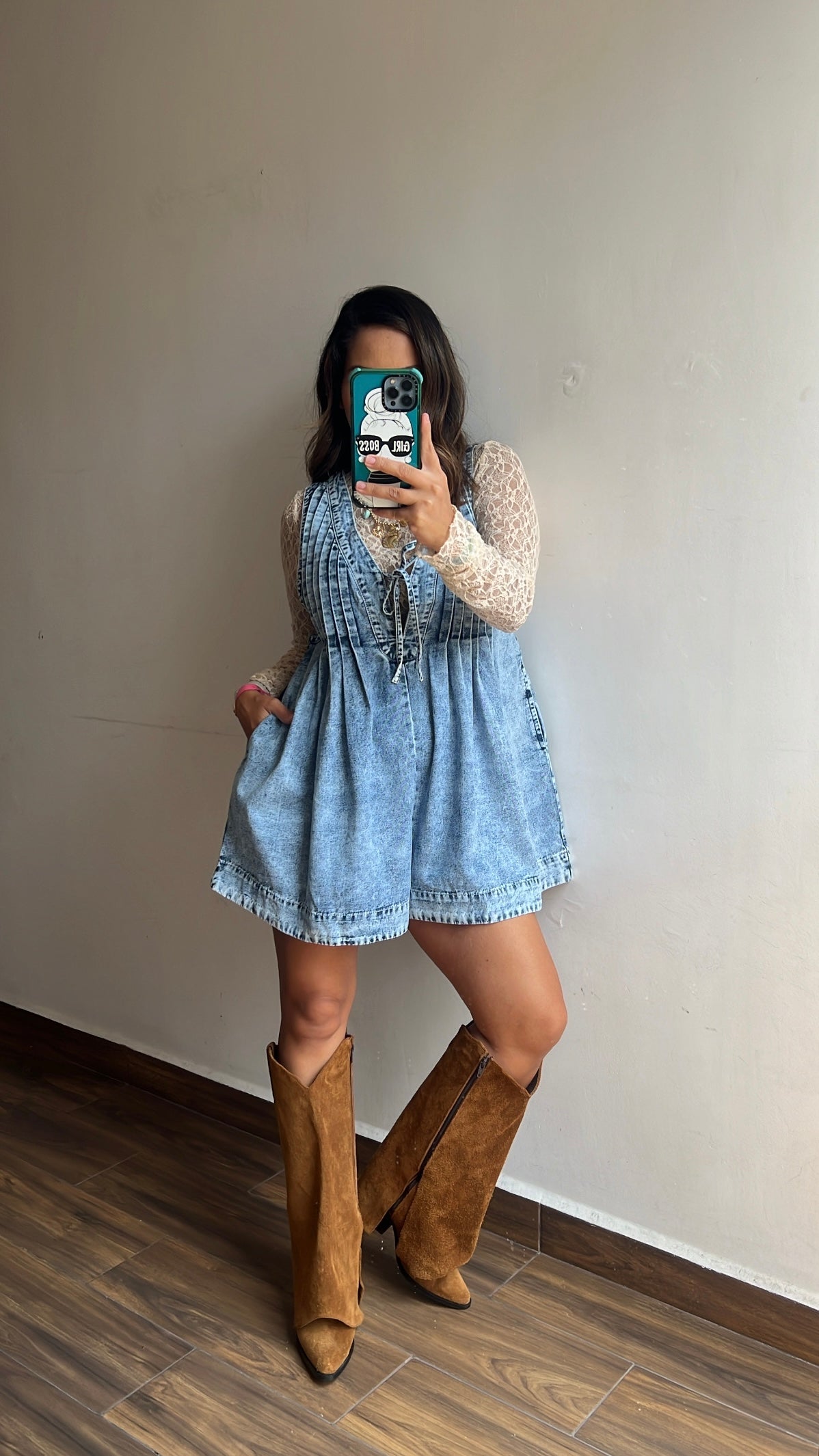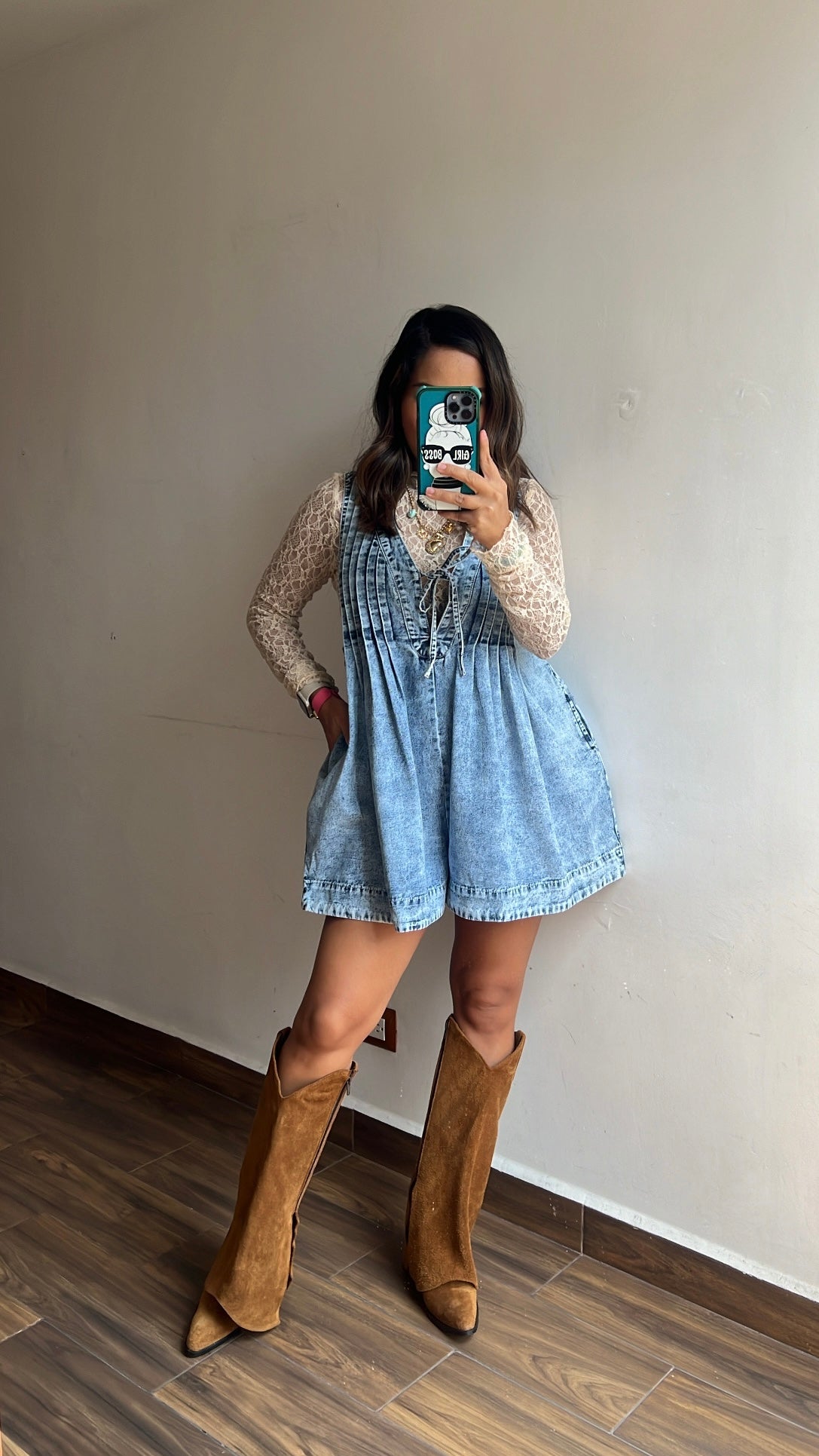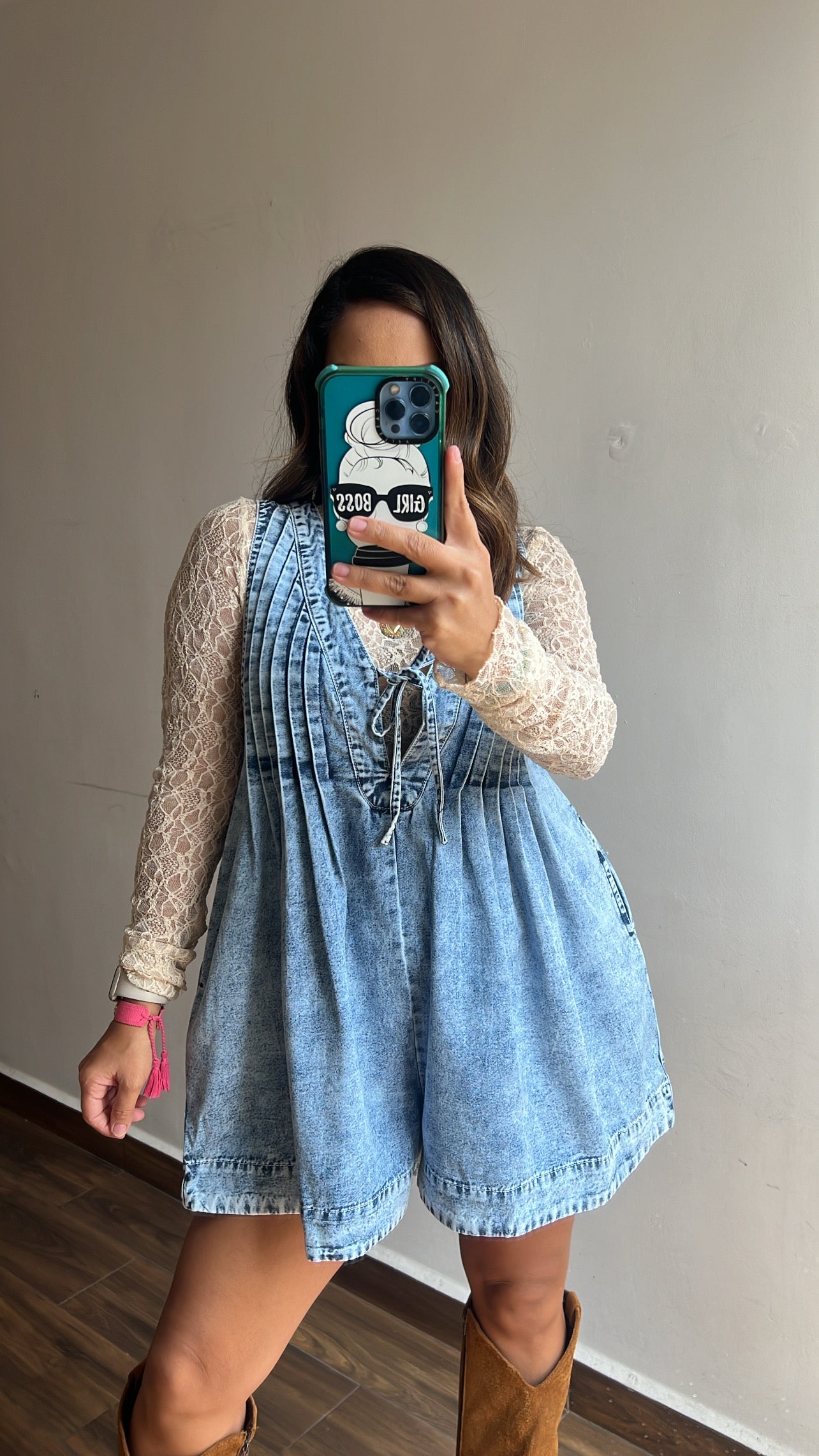Hermoso romper (short) denim con cuello V y cinta para atar al frente, de talle al frente plisados y bolsas en los costados.
