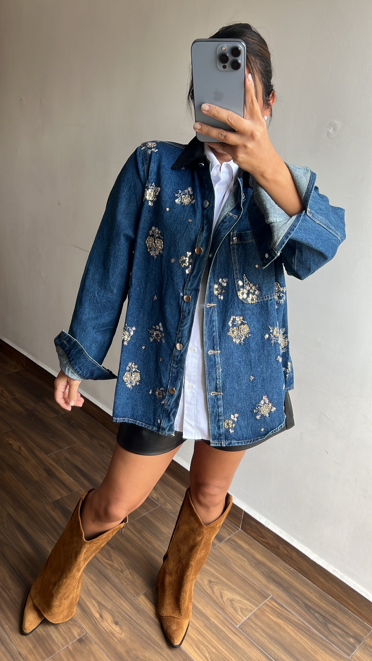 Sobrecamisa denim con lentejuelas y brillos bordados, con cuello de pana.