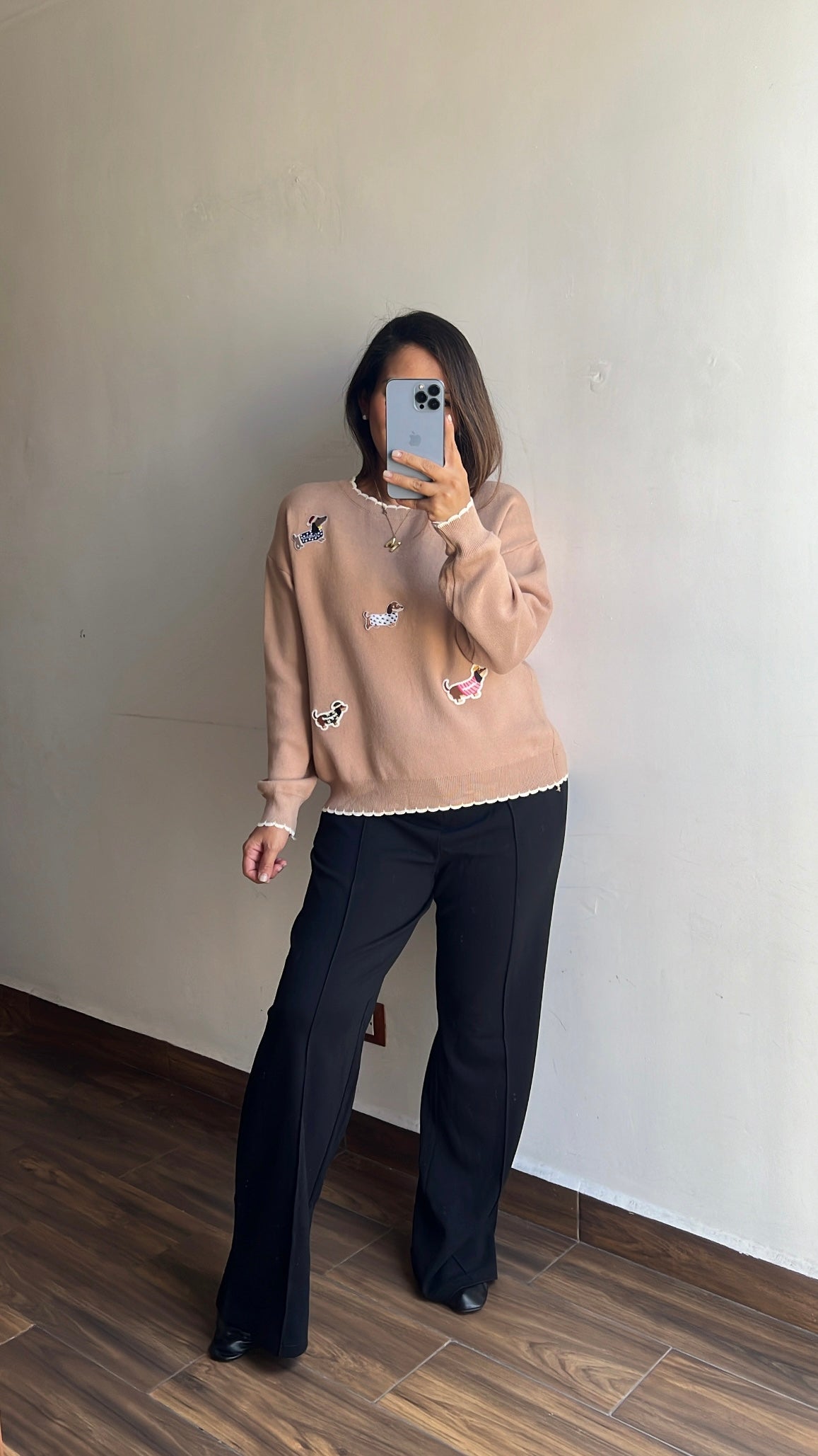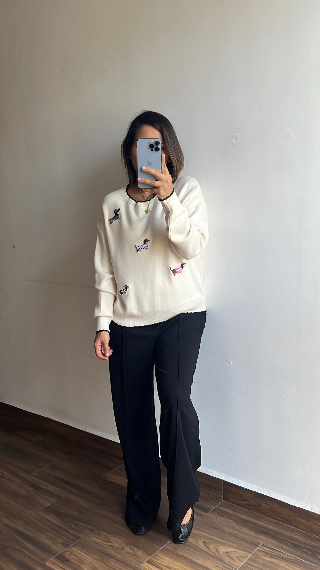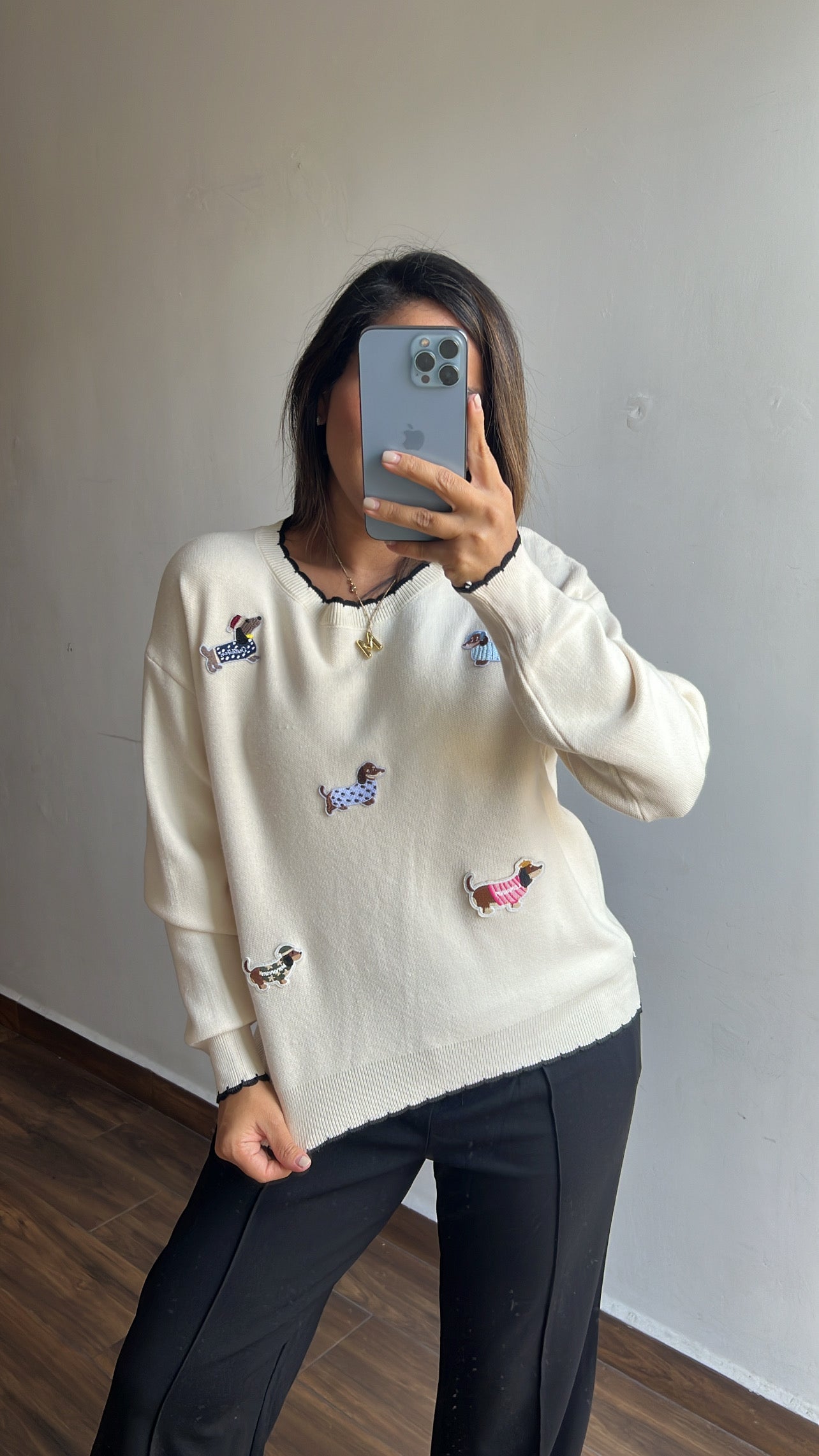 Hermoso sueter de punto, con aplicaciones de perritos.
