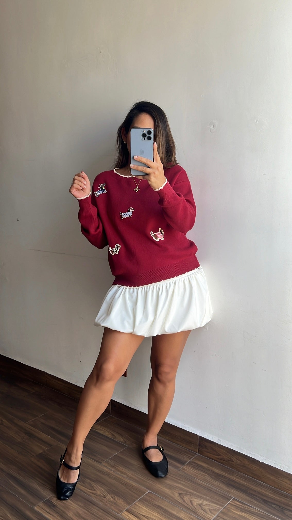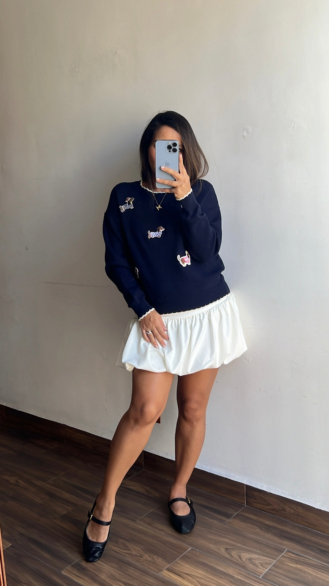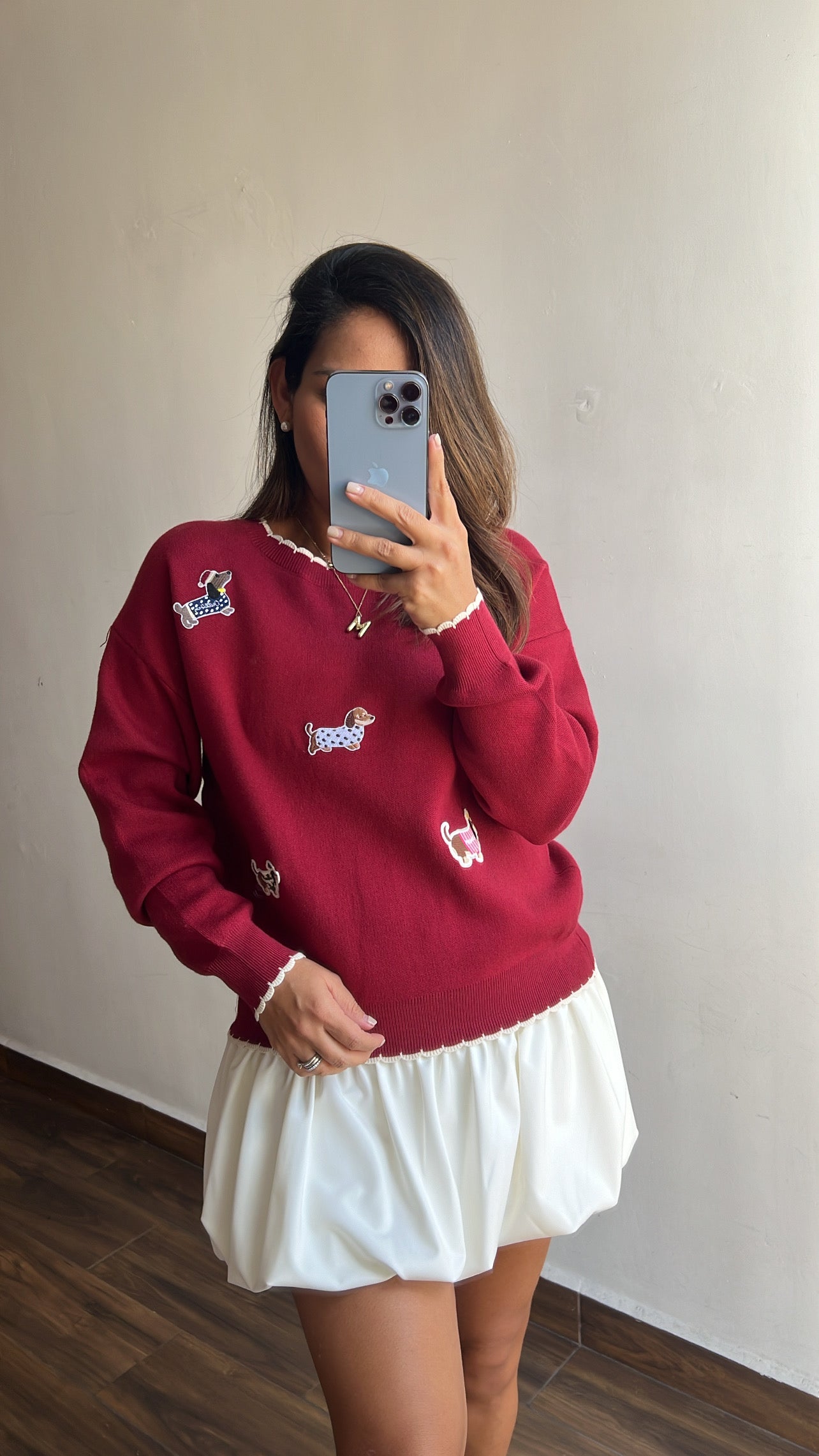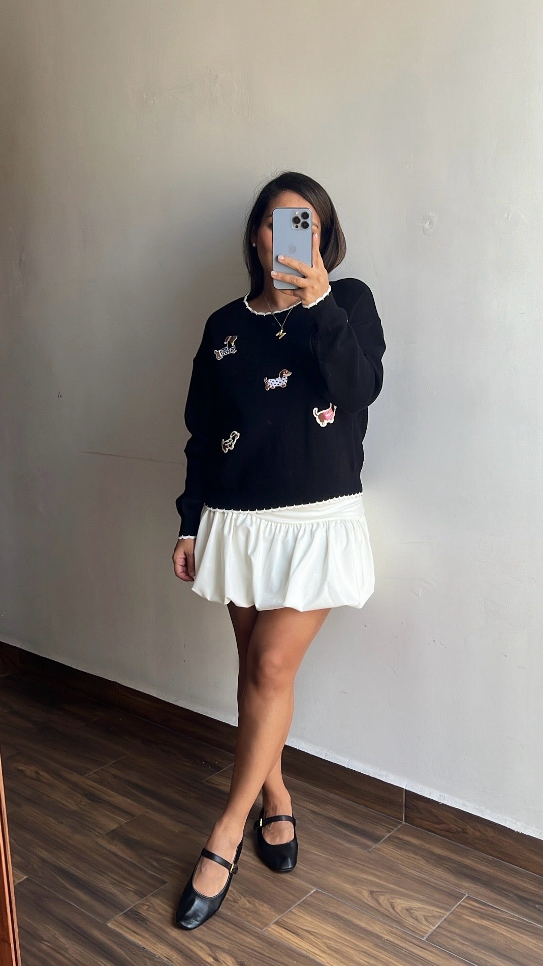 Hermoso sueter de punto, con aplicaciones de perritos.